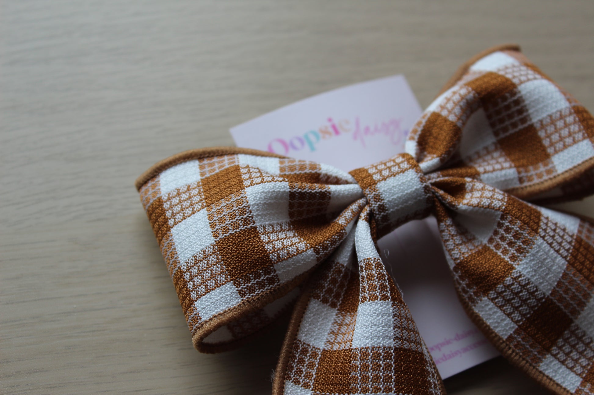 This hair bow features a large scale gingham design in copper and white tones.