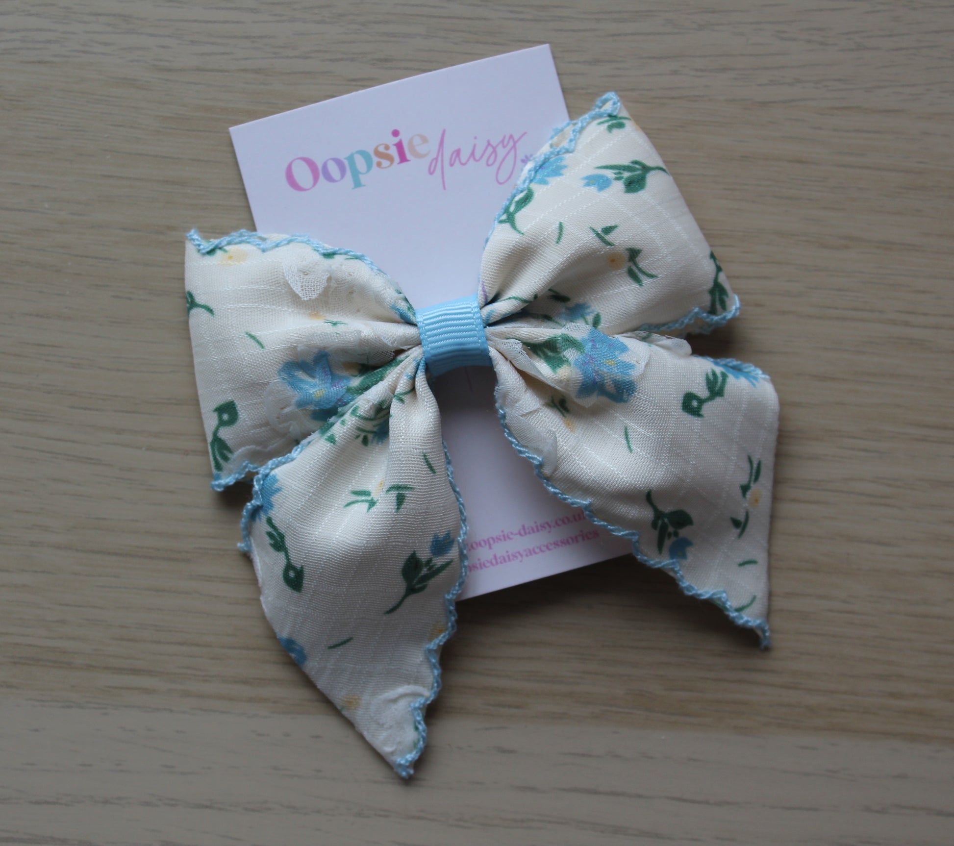This blue and off-white hair bow features a delicate floral design.
